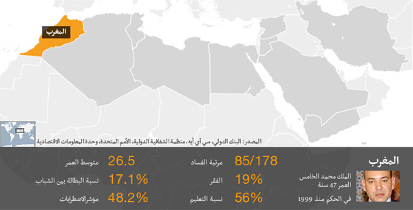 شهدت المغرب عددا من التظاهرات في الاسابيع القليلة الماضية. وحذرت أحزاب المعارضة من أن حكم الفرد المطلق سيكون الى زوال ما لم تجر اصلاحات اقتصادية جذرية.