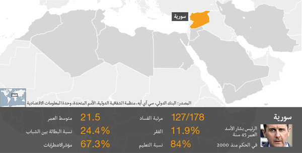 خرجت دعوات لـ “يوم غضب ” في سورية تزامنت مع تنحي الرئيس المصري حسني مبارك، لكن هذه الدعوات لم تترجم إلى مظاهرات معارضة للسلطة التي لا تسمح بتنظيم مثل هذه الاحتجاجات. وحتى الآن لا تزال البلاد هادئة.